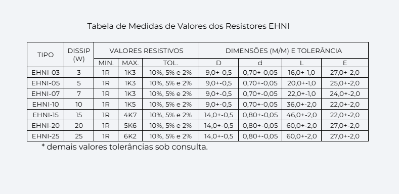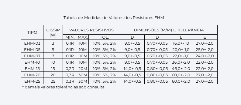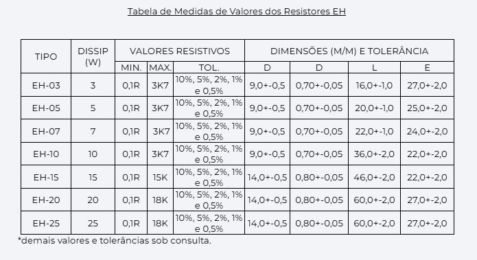 Os resistores de fio EH são fabricados com fios de ligas especiais, enrolados sobre o núcleo de cerâmica. Nos resistores de fio EHNI, os fios são enrolados de forma que não gerem campo magnético ou elétrico ao redor do resistor, e os resistores EHM são fabricados em metal filme sobre o núcleo de cerâmica. Em suas extremidades, são colocadas tampas metálicas, às quais são soldados os terminais em fios de cobre estanhado.