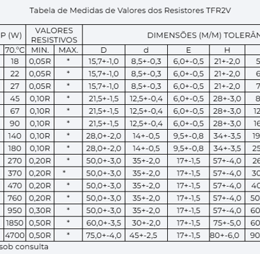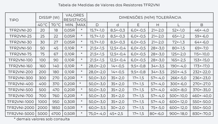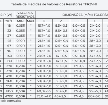 Nos resistores TFR2V o elemento resistivo com 2 ou mais valores em um mesmo resistor, é constituído de fios de ligas especiais, enrolados sobre um corpo de cerâmica de alta qualidade. Já nos resistores TFR2VNI, o fio é enrola de forma que não forme campo magnético ou elétrico ao redor do resistor.